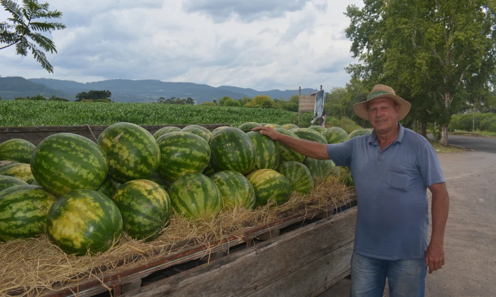 Dois Irmãos – Quem trafega pela BR-116 já se acostumou com a cena nesta época do ano: um caminhão vendendo melancias às margens da rodovia. O comércio é feito por José Inácio Arnold, que aproveita o período de maior consumo da fruta no verão.