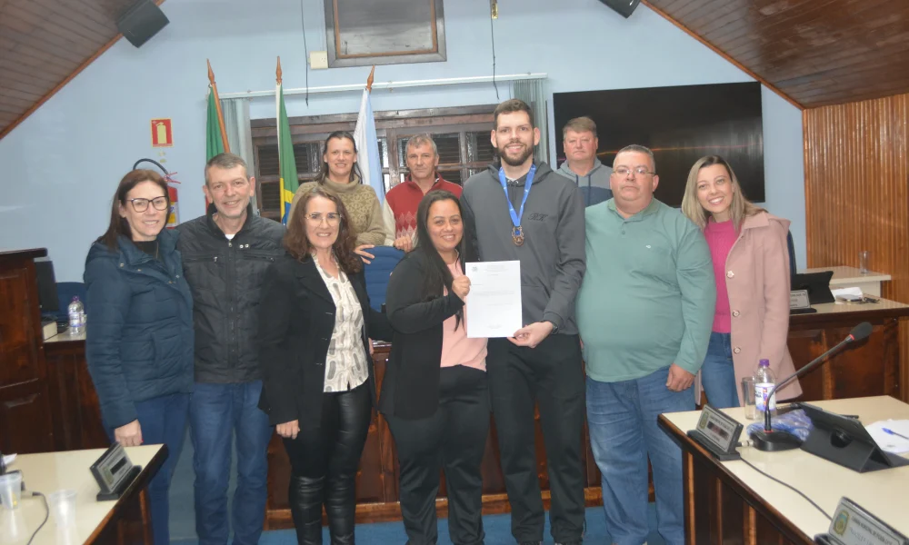 Picada Café – Um reconhecimento pela dedicação e por colocar o nome de Picada Café com o vice-campeonato brasileiro de Voleibol para Surdos. Isso a Câmara de Vereadores fez na noite de terça-feira, 23, com uma Moção de Reconhecimento prestada ao cafeense Richard Luan Klein, hoje com 28 anos. O jovem é filho de Sérgio Klein e Clarice Becker e perdeu a audição os 10 meses de vida após ter meningite. “Richard é um jovem cheio de energia, apaixonado pelo esporte e pela vida ativa. Encontrou na academia um espaço para se desafiar e evoluir, sempre buscando se superar a cada treino. O vôlei tem um lugar especial no seu dia a dia, é na quadra que ele se diverte, faz amigos e aprende o valor do trabalho em equipe”, frisou a vereadora Adriane Marconi Mielke, autora da Moção. Recentemente o cafeense defendeu as cores do RS no Campeonato Brasileiro, sendo vice campeão. Além da autora, outros vereadores enalteceram a luta de Richard e sua dedicação e evolução no esporte. Marilei Wittmann afirmou que “ele sempre soube buscar seus objetivos e essa conquista premia a persistência. É um orgulho para os pais e para Picada Café”, citou. Carina Adams afirmou que, assim como Richard, seu filho também teve meningite quando criança. “Nossos filhos deram a volta por cima. O Richard é um menino que segue seus sonhos”, declarou. Jair Schaab descreveu que acompanha a vida de Richard no esporte. “Eu e ele somos torcedores do Kibola. Mas foi no vôlei que ele buscou seu espaço e hoje representa muito bem nossa cidade e nosso estado”, afirmou. Para Franciele Simon Dielh, o cafeense é um exemplo. “O Richard nos inspira”, citou. Já Eloir Bauer afirmou que Richard é “um grande desportista, mas, acima de tudo, um exemplo de pessoa”.