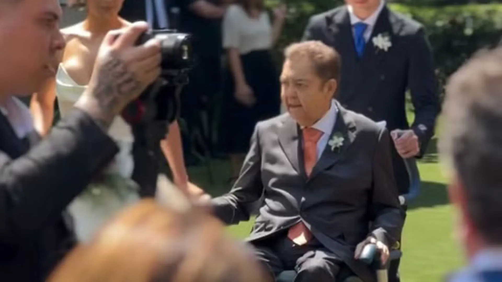 Em registros compartilhados pelo filho, João Silva, Faustão aparece de cadeira de rodas, de mãos dadas com a noiva durante a entrada na cerimônia.