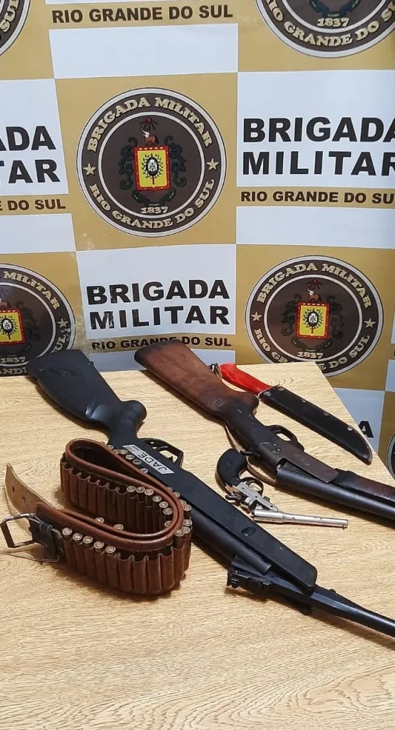 Durante a incursão, os policiais confirmaram a presença de armas na residência. Foram localizadas duas armas de fogo — uma garrucha e uma arma longa — além de uma arma de pressão, munições em uma cartucheira de couro e uma faca, todas ao lado do colchão e ao alcance dos moradores. Devido ao estado alterado do casal, foi necessário o uso de algemas para efetuar a prisão. A guarnição de Picada Café prestou apoio na ocorrência, e o casal, junto ao material apreendido, foi encaminhado à Delegacia de Polícia.