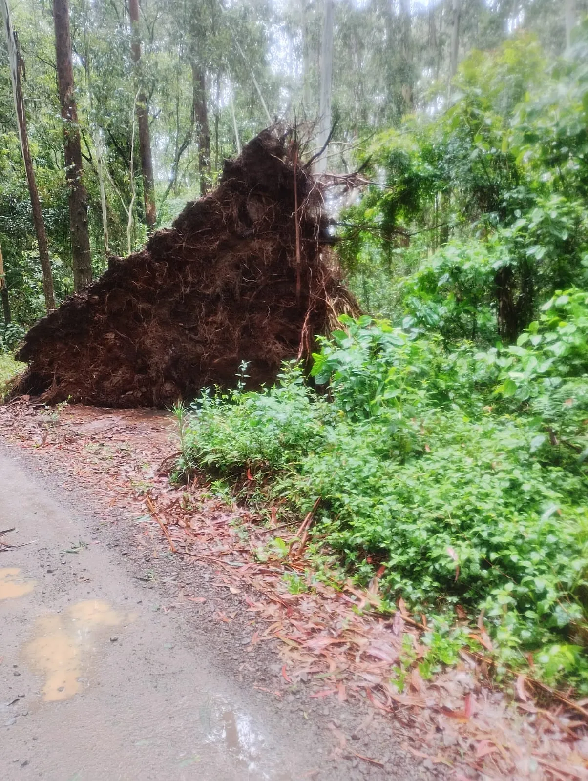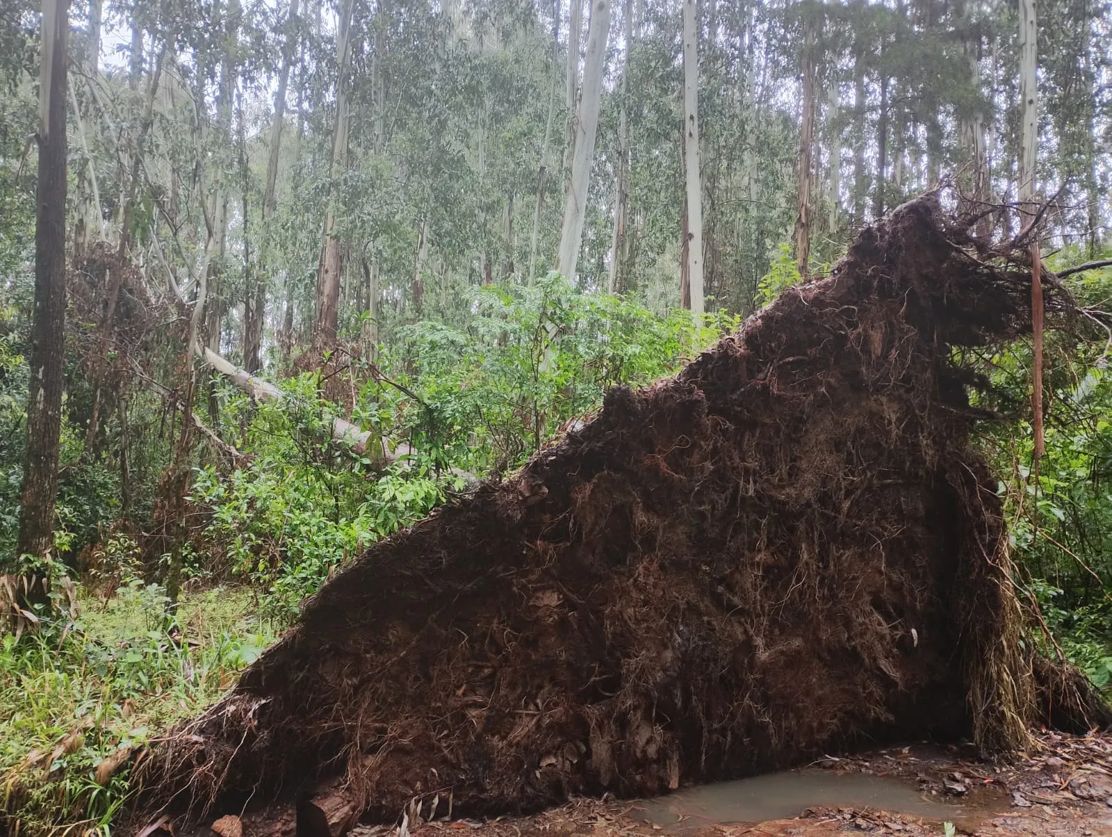 Santa Maria do Herval | Uma forte ventania arrancou uma árvore de eucalipto no bairro Boa Vista do Herval, perto do restaurante Alles. O registro foi feito nesta tarde de sábado (8), mas segundo moradores, a árvore já está caída há semanas no local.